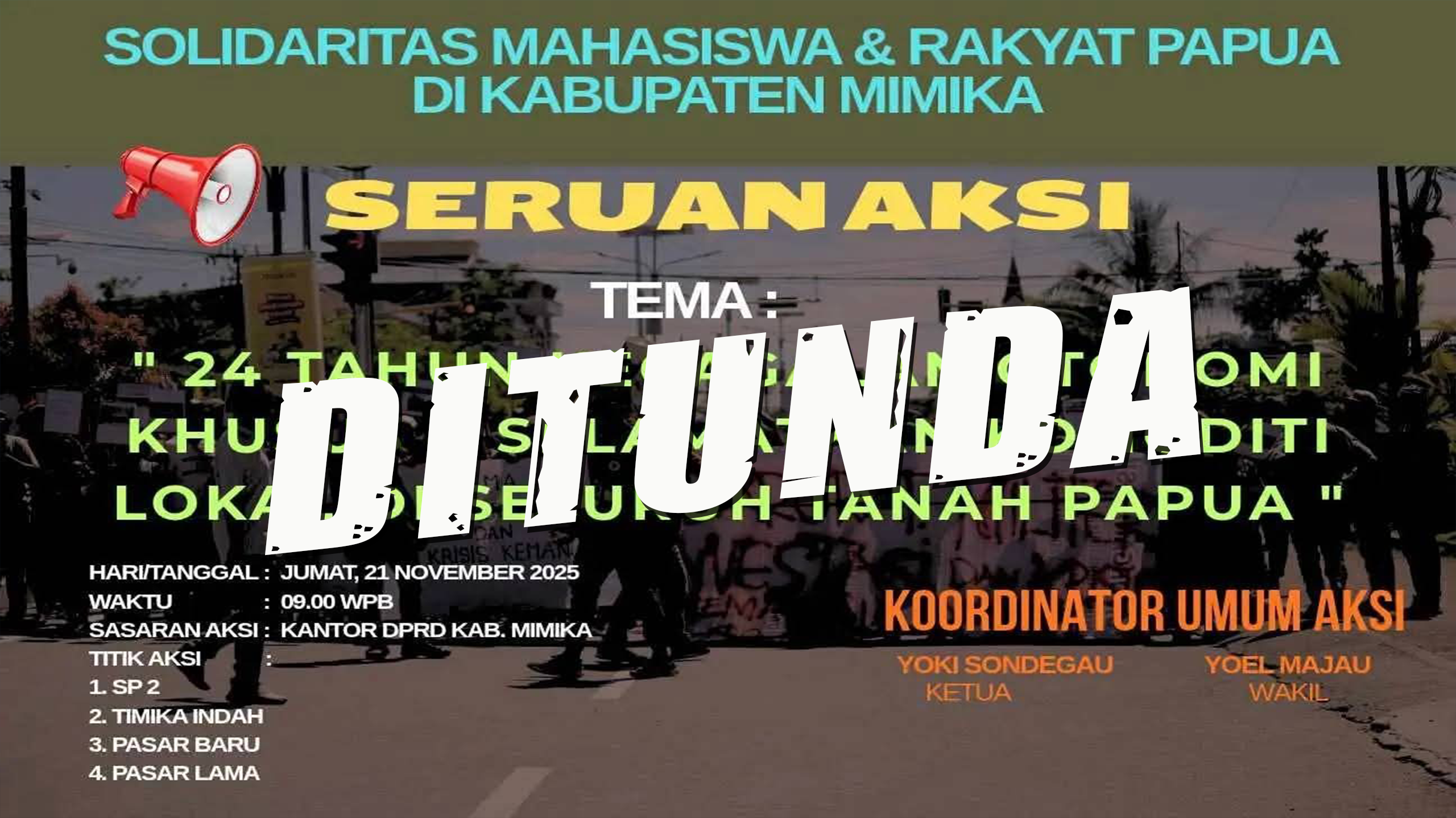 INFONUSANTARATIMUR.com – MIMIKA – Aksi Solidaritas Mahasiswa dan Rakyat Papua di Kabupaten Mimika yang rencananya akan digelar pada Jumat, 21 November 2025 pukul 09.00 WIT, dengan tema “24 Tahun Kegagalan Otonomi Khusus dan Selamatkan Komoditi Lokal di Seluruh Tanah Papua”, resmi ditunda. Keputusan ini diambil setelah mempertimbangkan situasi di lapangan dan pentingnya memastikan keselamatan seluruh peserta aksi.