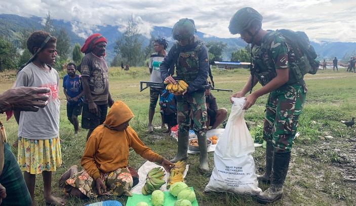 Personel Satgas Pamtas RI-PNG Mobile Yonif 113/JS dari Kabupaten Bireuen, Aceh, memborong hasil tani dari warga lokal di Pasar Bandara Pugapa, Distrik Homeyo, Kabupaten Intan Jaya, Provinsi Papua Tengah, Minggu (28/9/2025).