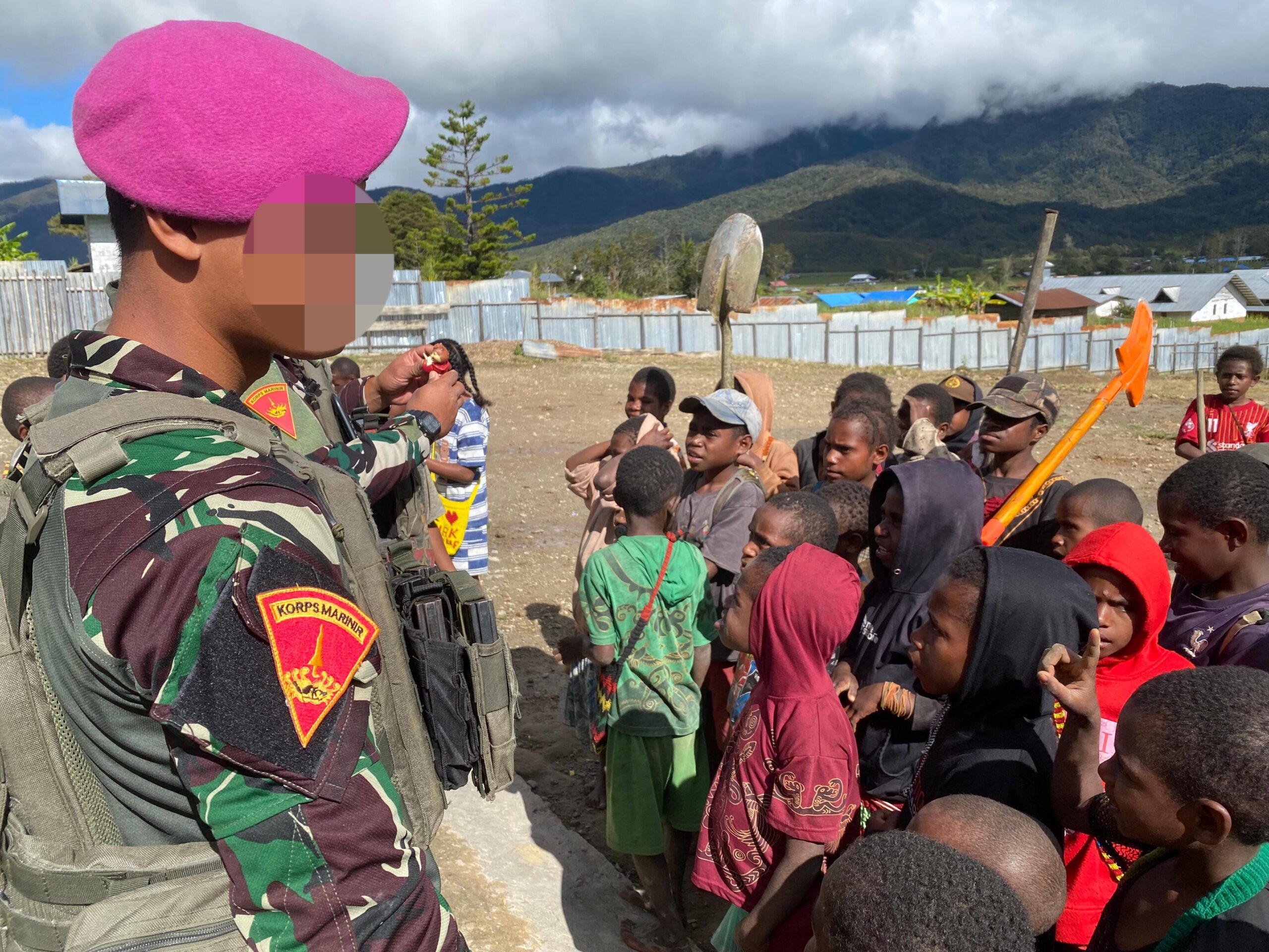Prajurit Satuan Tugas (Satgas) Pamtas RI-PNG Mobile 2025 Batalyon Infanteri 4 Marinir (Yonif 4 Mar) jalin kebersamaan dengan anak-anak dan warga Papua dengan menggelar komunikasi sosial, bertempat di Distrik Obano,Kab. Paniai Barat, Papua Tengah, Papua, Minggu (05/04/2025).