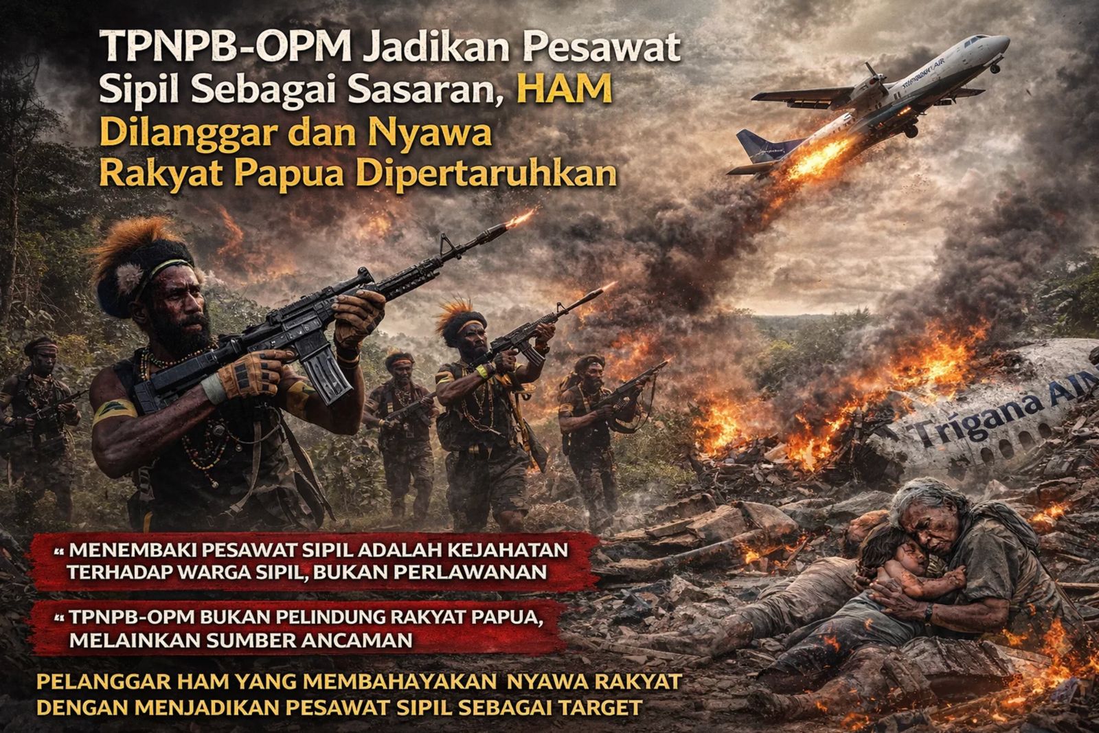 INFONUSANTARATIMUR.COM – Penembakan terhadap pesawat sipil Trigana kembali menegaskan eskalasi kekerasan yang kian menjauh dari nilai-nilai kemanusiaan. Aksi tersebut dinilai sebagai pelanggaran hak asasi manusia yang terang-terangan, karena secara langsung membahayakan penumpang tak bersenjata—ibu, anak, dan orang tua—yang menggantungkan keselamatan hidupnya pada transportasi udara di wilayah Papua.