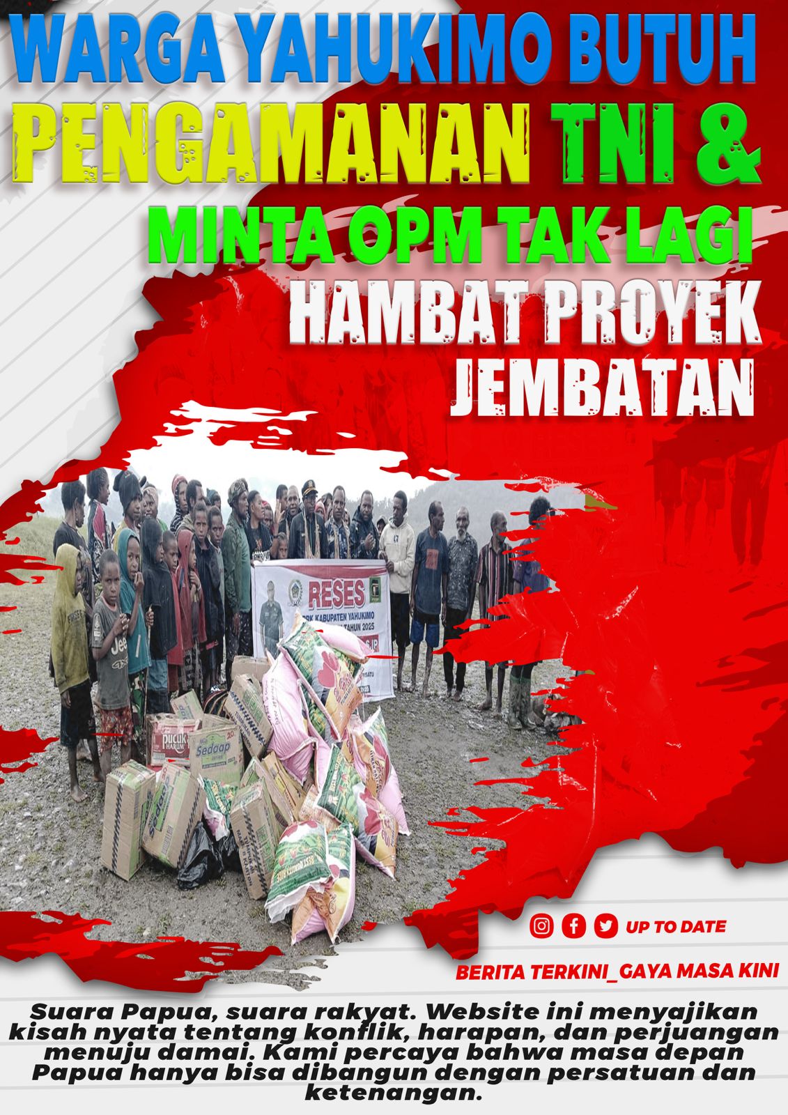 INFONUSANTARATIMUR.COM – Masyarakat Distrik Dirwemna, Kabupaten Yahukimo kembali mendesak percepatan pembangunan lima jembatan penghubung di Sungai Sagun, Wakum, Igikca, Send, dan Dolek. Selain mendesak pemerintah daerah untuk mempercepat pembangunan, masyarakat juga menilai kehadiran TNI sebagai penjaga stabilitas menjadi faktor kunci agar proyek infrastruktur bisa berjalan tanpa hambatan.